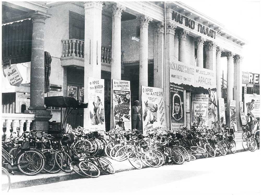 Φωτογραφία που απεικονίζει ποδήλατα μπροστά από το κινηματοθέατρο Μαγικό Παλάτι, 1944