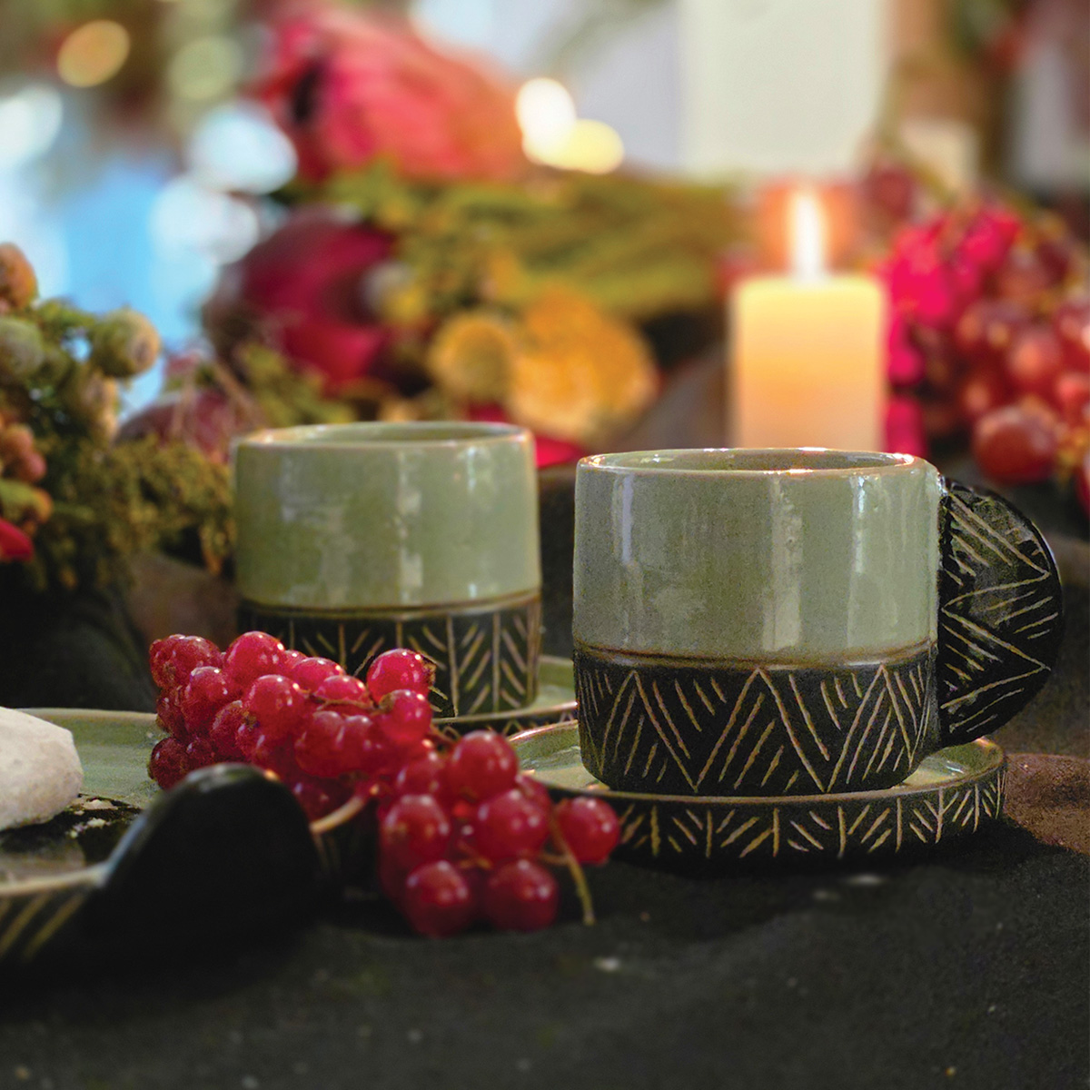 Κεραμική κούπα καφέ με πιατάκι, διακοσμημένα
