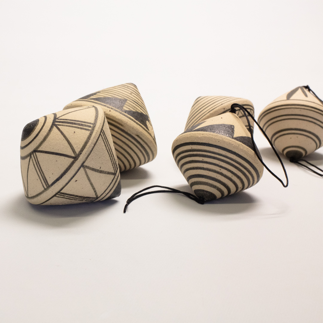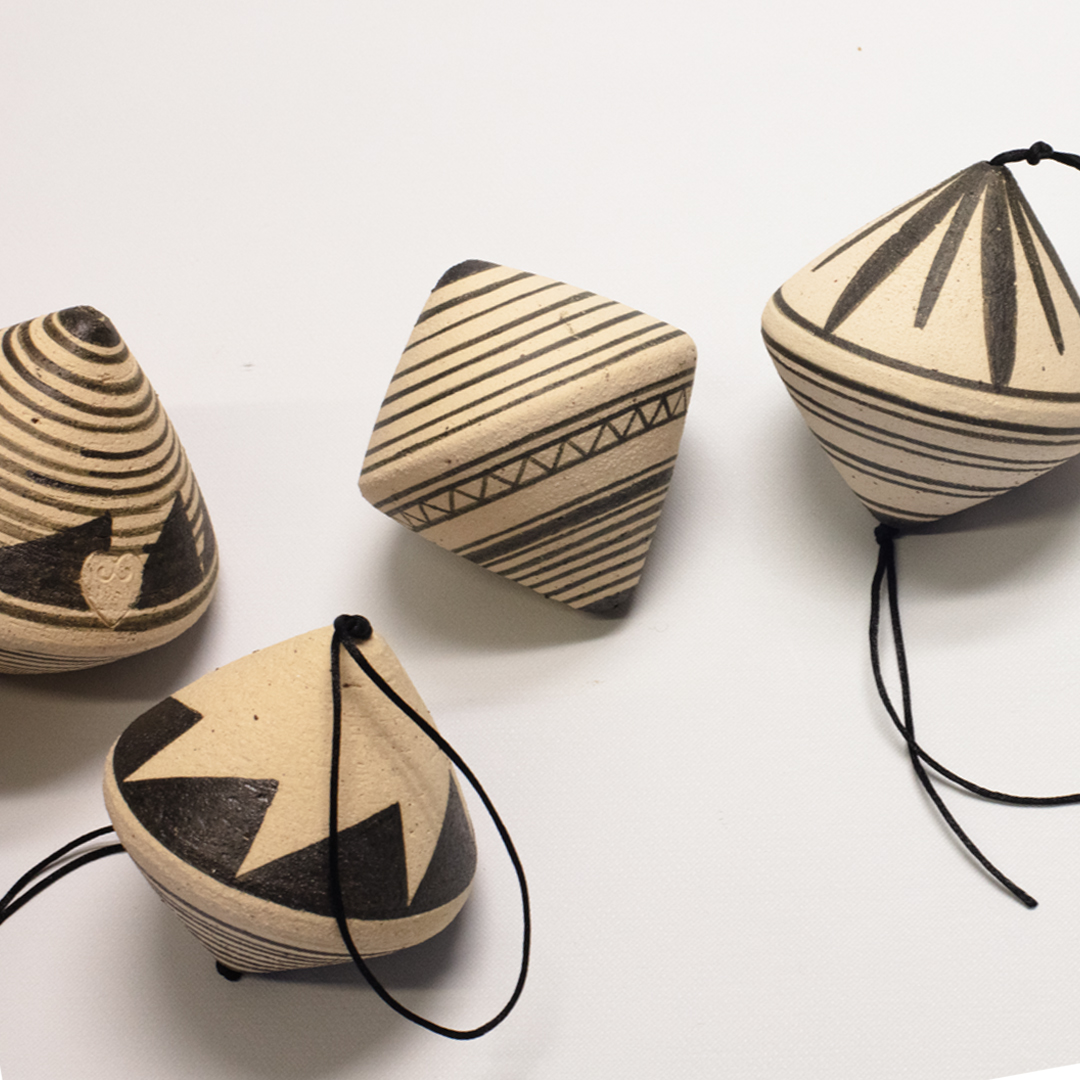 Ceramic spinning top with motifs and designs inspired by