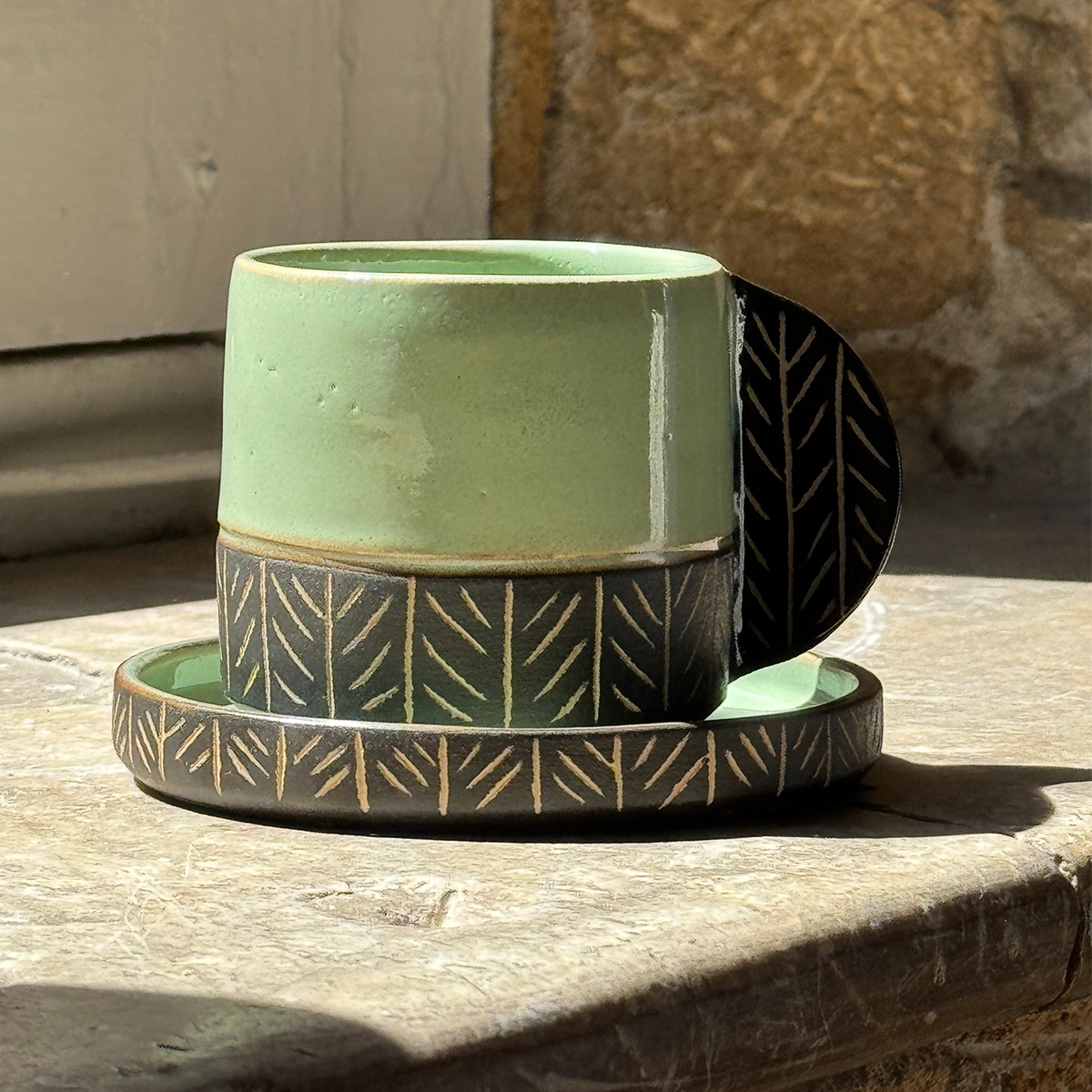 Ceramic coffee cup with saucer, with linear motifs from the designs